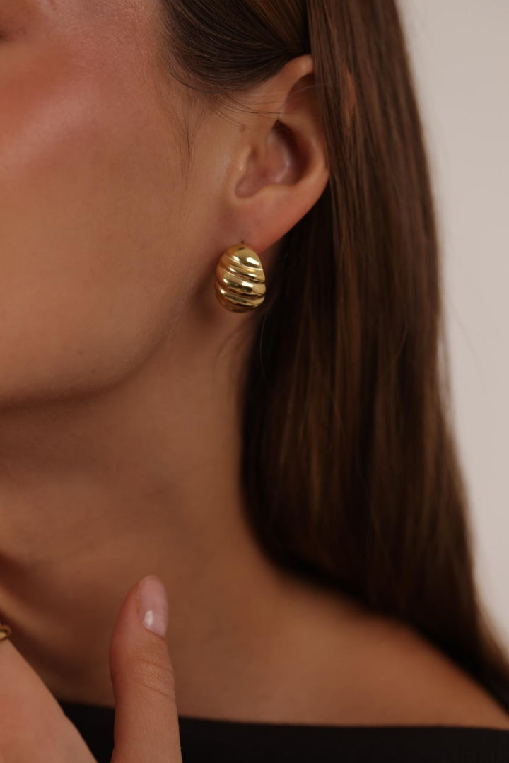 Boucles d'oreilles à puce en acier inoxydable composées d'une grande pièce en forme d'ovale incurvée aux allures de coquillage.