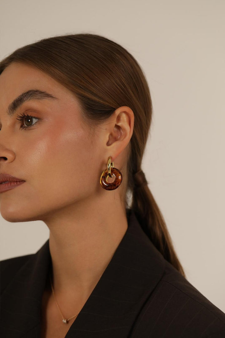 Boucles d'oreilles type créoles, en acier inoxydable composées d'un anneau simple ainsi que d'une pièce en forme de donut en acétate coloré.